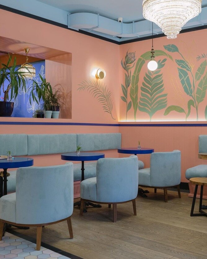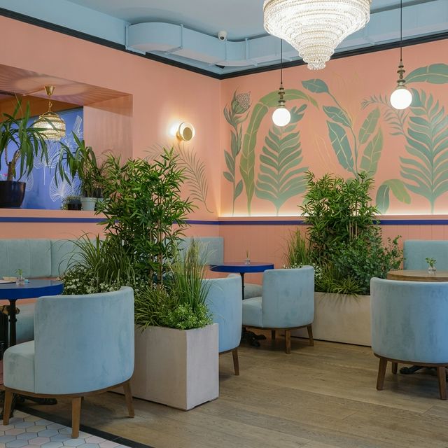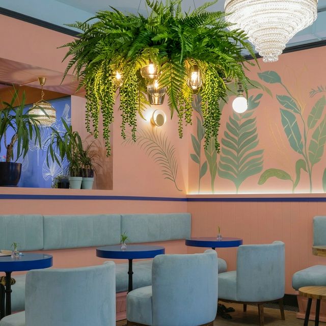 Вертикальное озеленение(** Эта розовая стена над диванной зоной — идеальное место для массивной фитостены, которая добавит интерьеру свежести и природной гармонии. Зеленое полотно не только станет ярким акцентом, но и создаст более уютную атмосферу для гостей, подчеркивая эко-стиль заведения «Скворец!».)