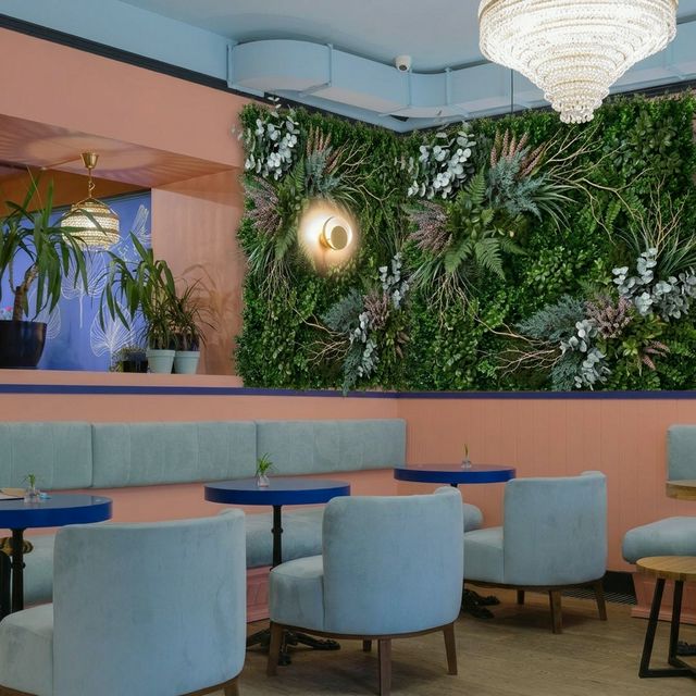 Вертикальное озеленение(** Эта розовая стена над диванной зоной — идеальное место для массивной фитостены, которая добавит интерьеру свежести и природной гармонии. Зеленое полотно не только станет ярким акцентом, но и создаст более уютную атмосферу для гостей, подчеркивая эко-стиль заведения «Скворец!».)